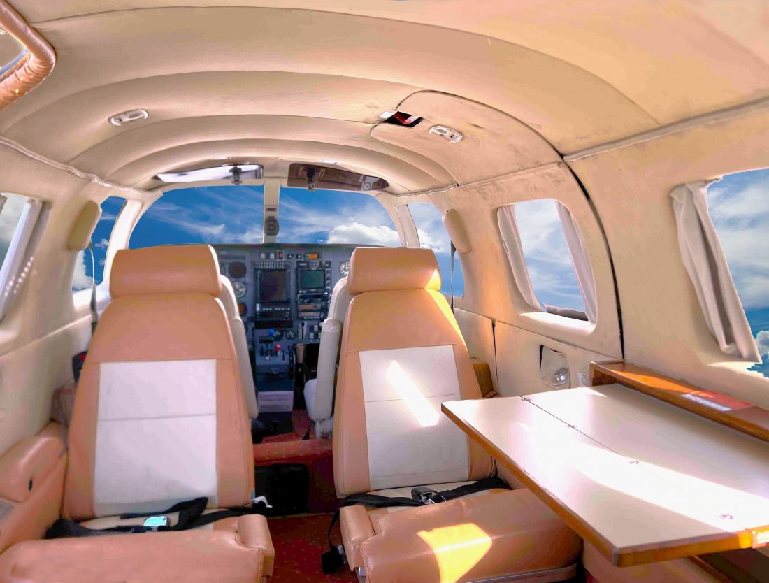 Orange carpet and light orange and beige leather club cabin seating. Upholstered white textile seat covers in cockpit.