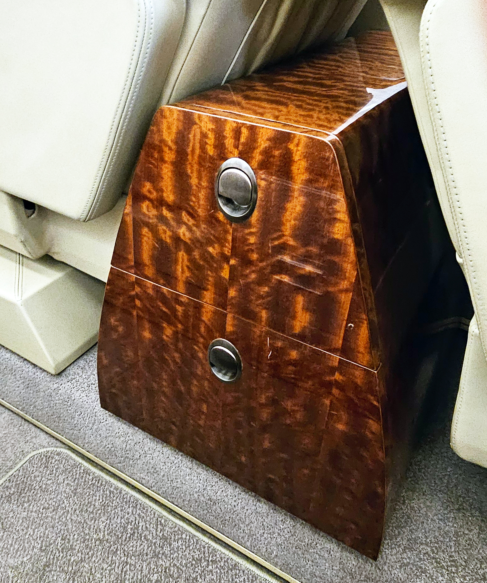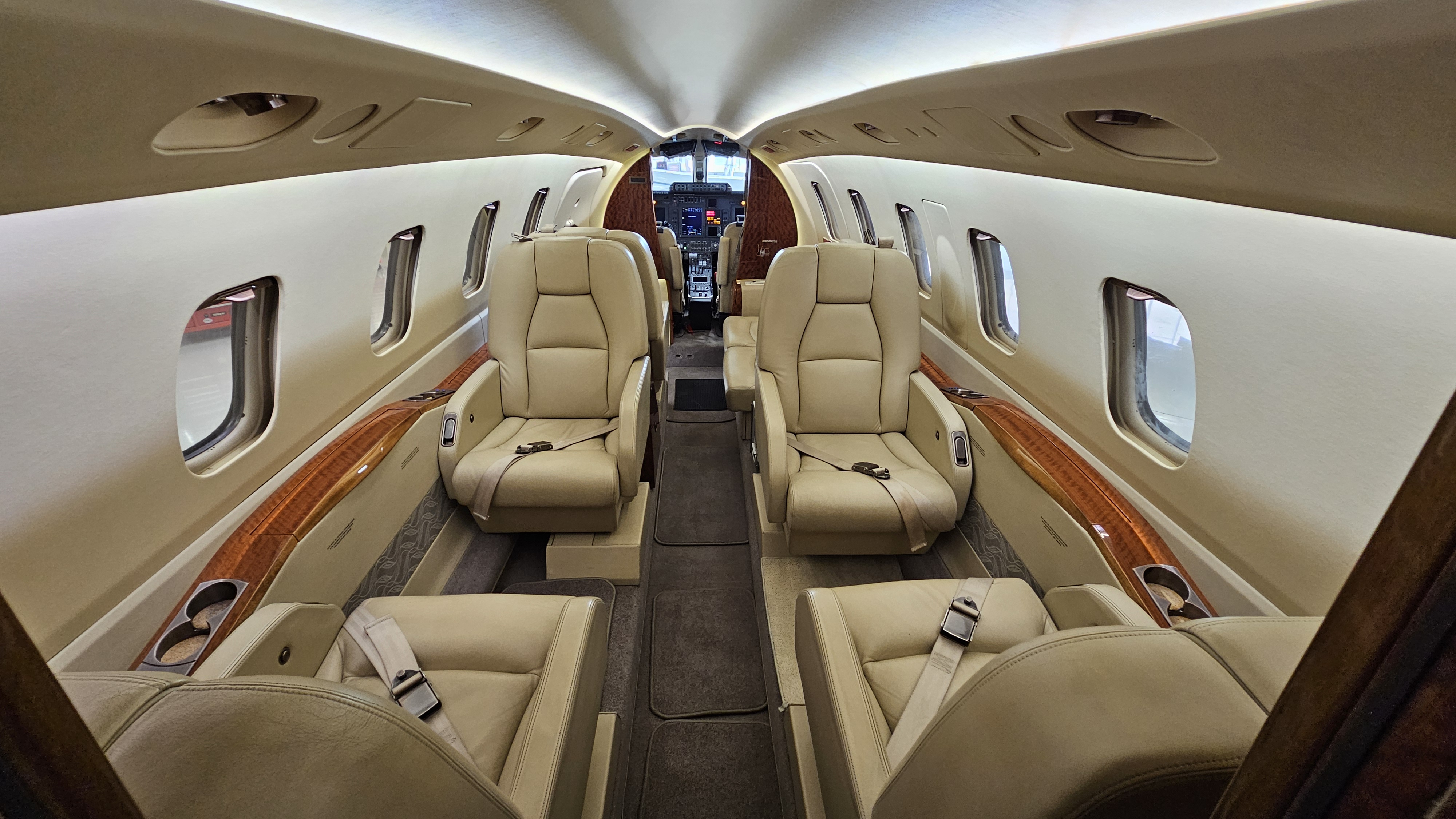 - Light Beige leather upholstering with high-gloss wood veneer trimming