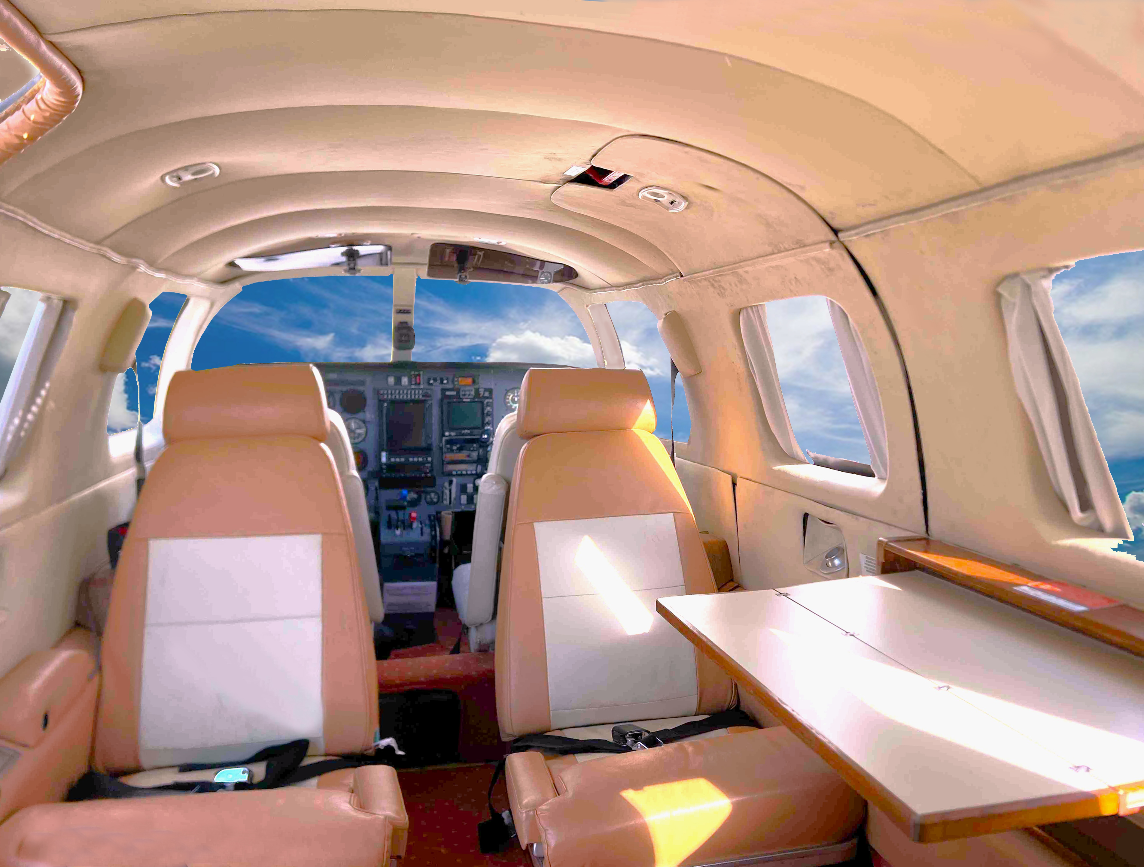 Orange carpet and light orange and beige leather club cabin seating. Upholstered white textile seat covers in cockpit.